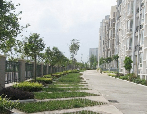 植草砖硬化面积大,中心植草部位多属于硬化土,雨水无法下渗,积水严重的同时不利于地下水补充。其嵌入式植草的结构破坏了草体的连续性,大多数植草不能成活,绿化率更是大大降低。